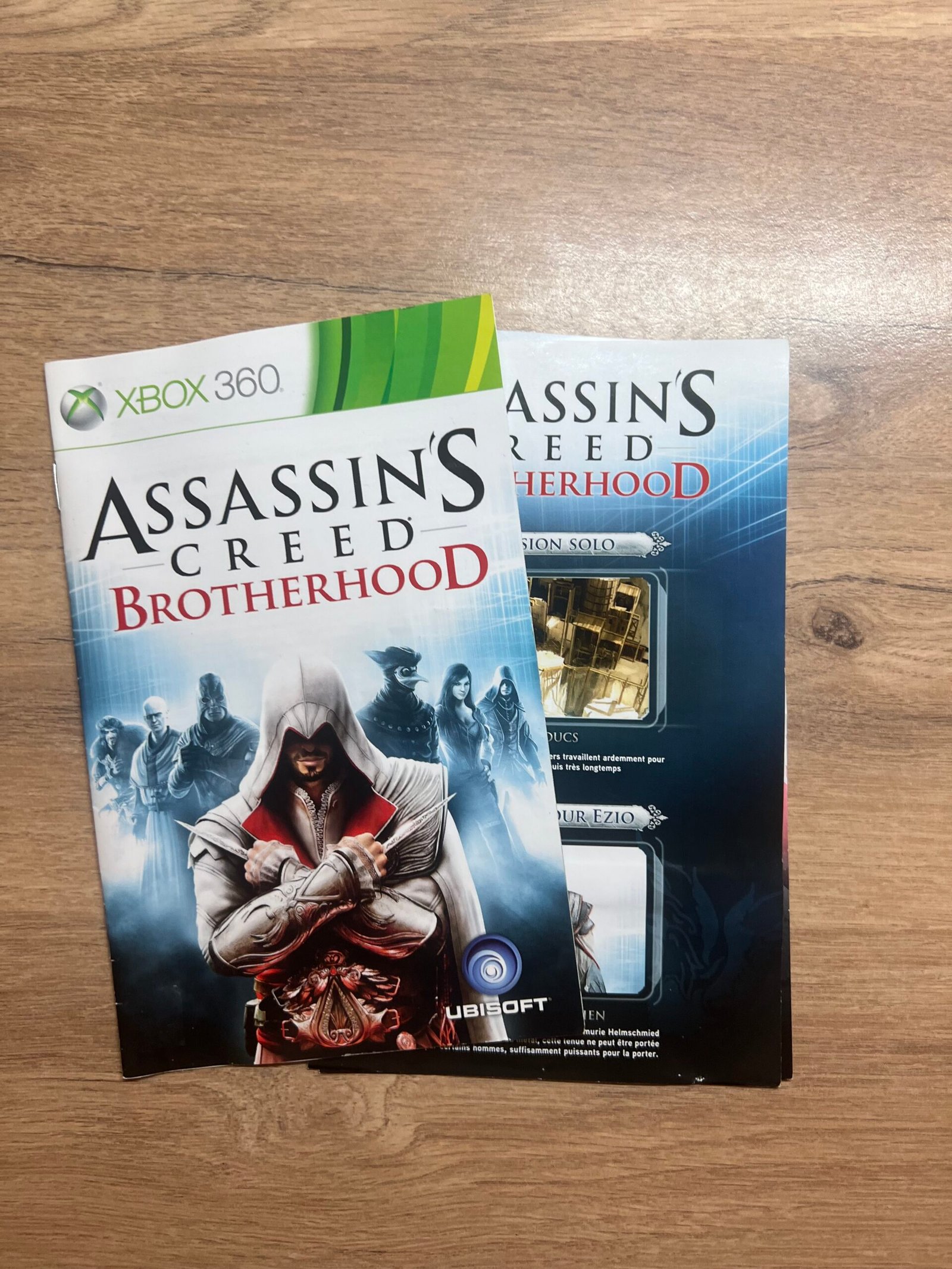 Je propose le jeu Assassin’s Creed Brotherhood sur xbox 360 , le premier opus de la célèbre saga, où vous incarnez Altaïr, un assassin du Moyen-Âge parcourant Jérusalem, Damas et Acre pour accomplir des missions secrètes.