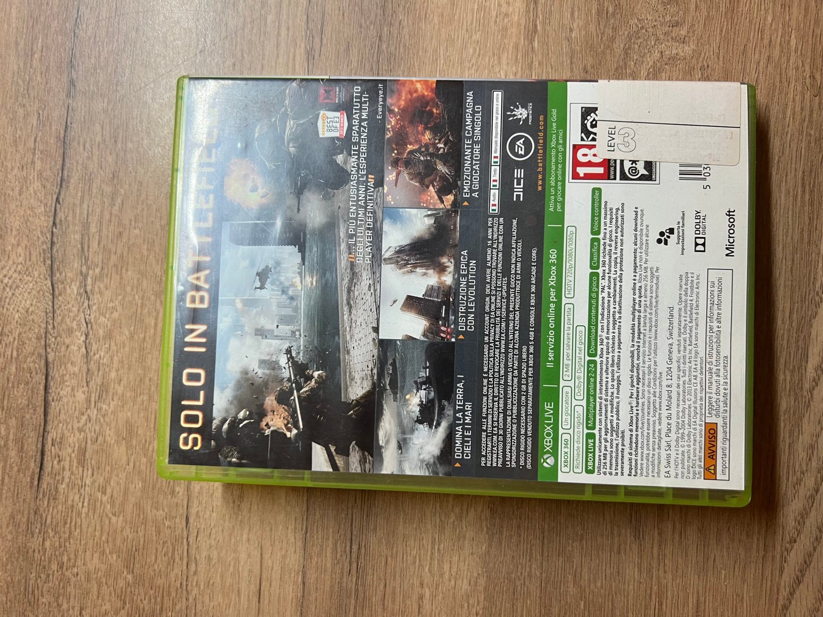 Je propose Battlefield 4 sur Xbox 360, un jeu de tir multijoueur emblématique avec des cartes destructibles, des combats intenses et une campagne solo militaire moderne.