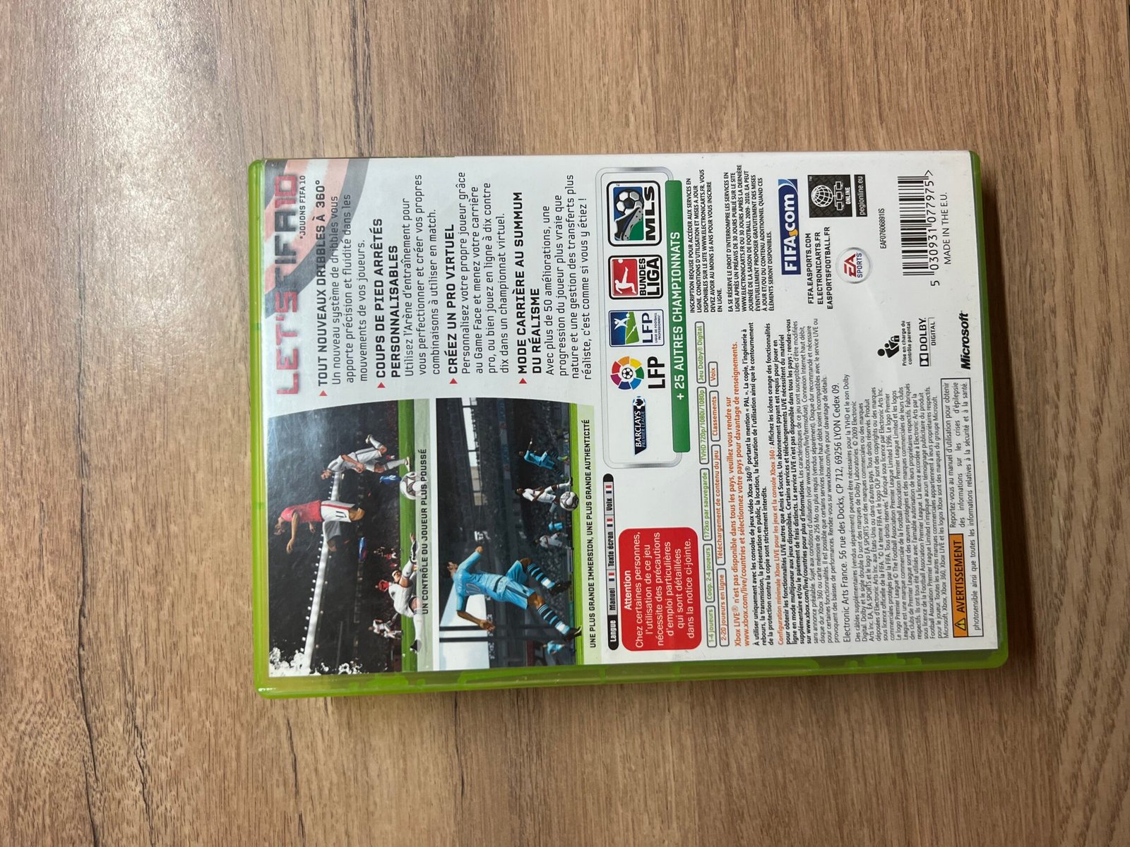 Je propose le jeu FIFA 10 sur Xbox 360, un classique du foot avec gameplay fluide et licences officielles.