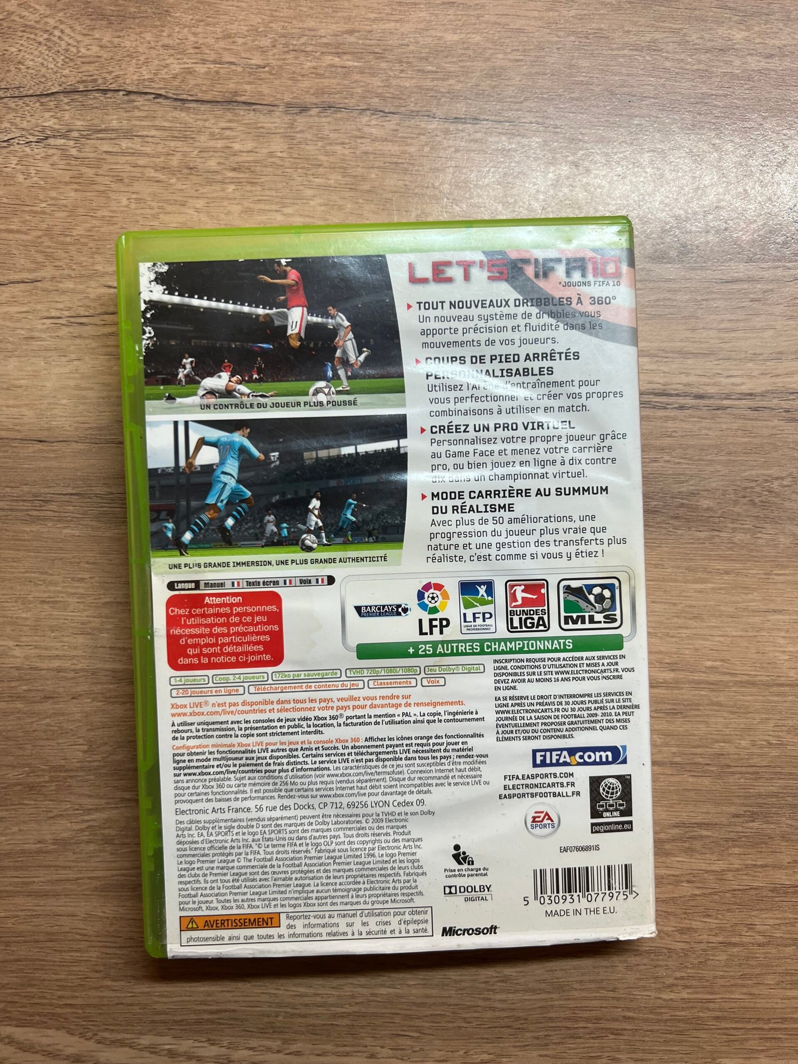 Je propose le jeu FIFA 10 sur Xbox 360, un classique du foot avec gameplay fluide et licences officielles.