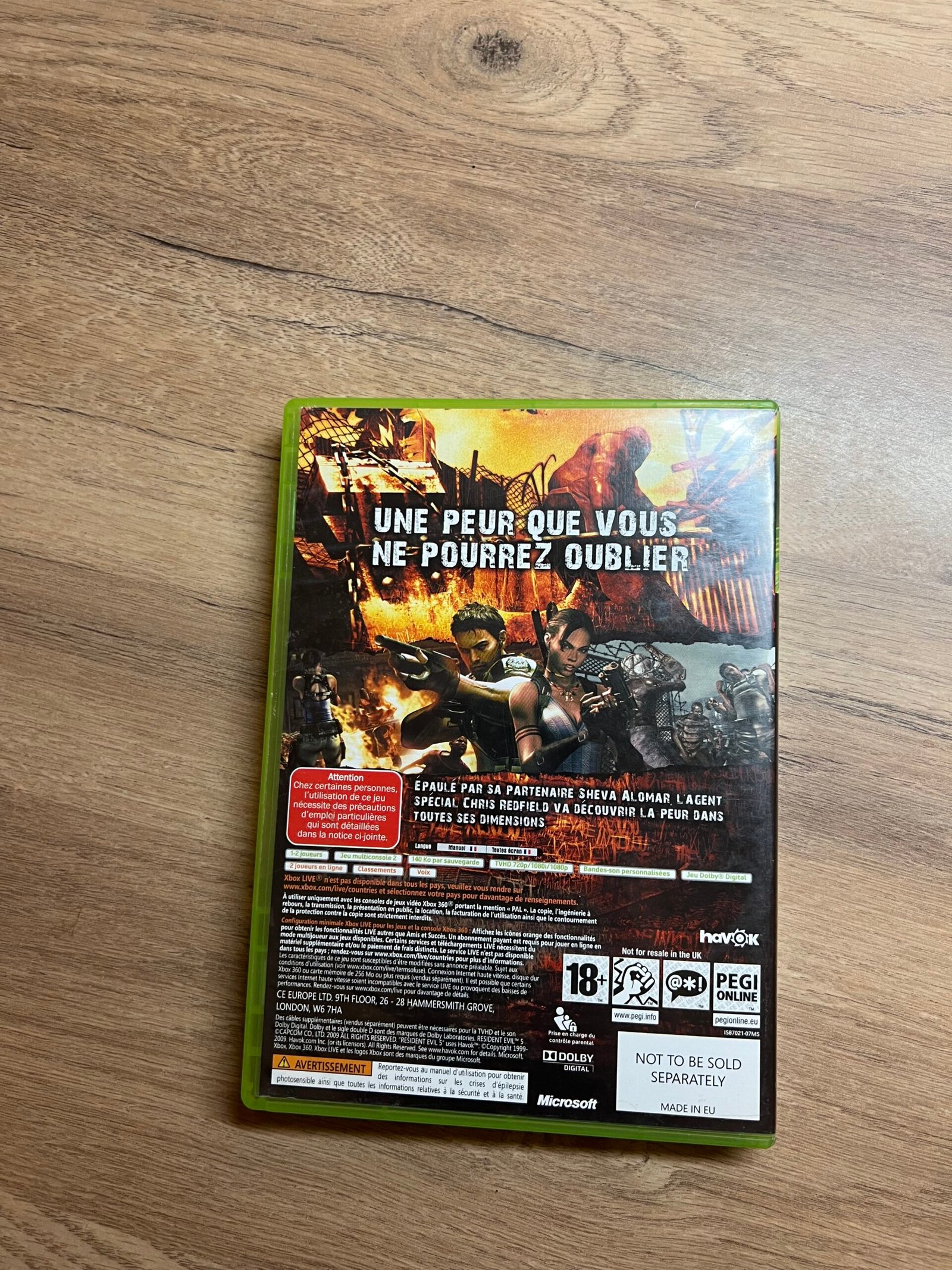 Je propose Resident Evil 5 sur Xbox 360, un jeu de tir et de survie intense, jouable en solo ou en coopération. Partez en Afrique avec Chris Redfield pour affronter une nouvelle menace biologique, mêlant action, tension et ambiance sombre.